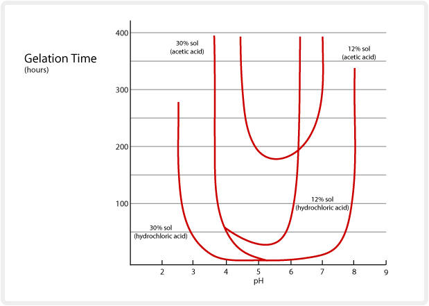 The higher the concentration or the smaller the particle size, the greater the effect pH change will have on gelation time and stability. SNOWTEX is very stable in the 2-4 and 8-10 pH ranges as illustrated in the diagram below. If a formulation or coating system has a neutral pH, or the formulation requires a colloidal silica with greater stability, SNOWTEX-C can be used.