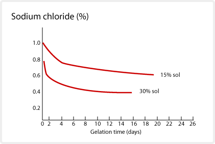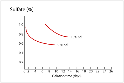 Polyvalent metal ions will cause SNOWTEX to gelate. This is because the polyvalent ions interfer with the surface charge of the SNOWTEX. The resulting charge imbalance causes the particles to agglomerate. The surface charge maintains the SNOWTEX stability. The degree of gelation is not uniform, and varies depending on the type, concentration, temperature, etc. of the electrolyte used. Monovalent salts react slowly, but polyvalent salts such as alum, react quickly at pH 9 and higher. When the pH is lowered, the effect of alum and magnesium sulfate decreases. This electrolytic effect on SNOWTEX is useful to speed up or slow down the gelation. The gelation time of SNOWTEX at 52° C with addition of sodium chloride and sulfate are depicted below.