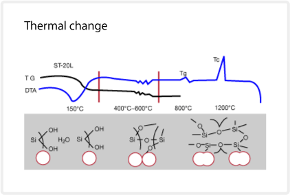At approximately 150°C, water desorbs from the silica gel, resulting in a weight reduction of approximately 5%. Dehydration of the silanol groups at 400-700°C causes another small weight reduction. Up to this temperature, the particles remain unchanged, but at approximately 800°C, surface fusion between the silica particles occurs. At the glass transition (Tg), the mechanical strength of the silica increases. At approximately 1200°C , an exothermic peak is caused by crystallization (Tc) into cristobalite. The melting point is estimated at 1700°C. The glass transition temperature, crystallization temperature and melting point depend on the amount of sodium ion in the SNOWTEX. The melting points of SNOWTEX-O and SNOWTEX-N are higher because they contain less sodium ions.